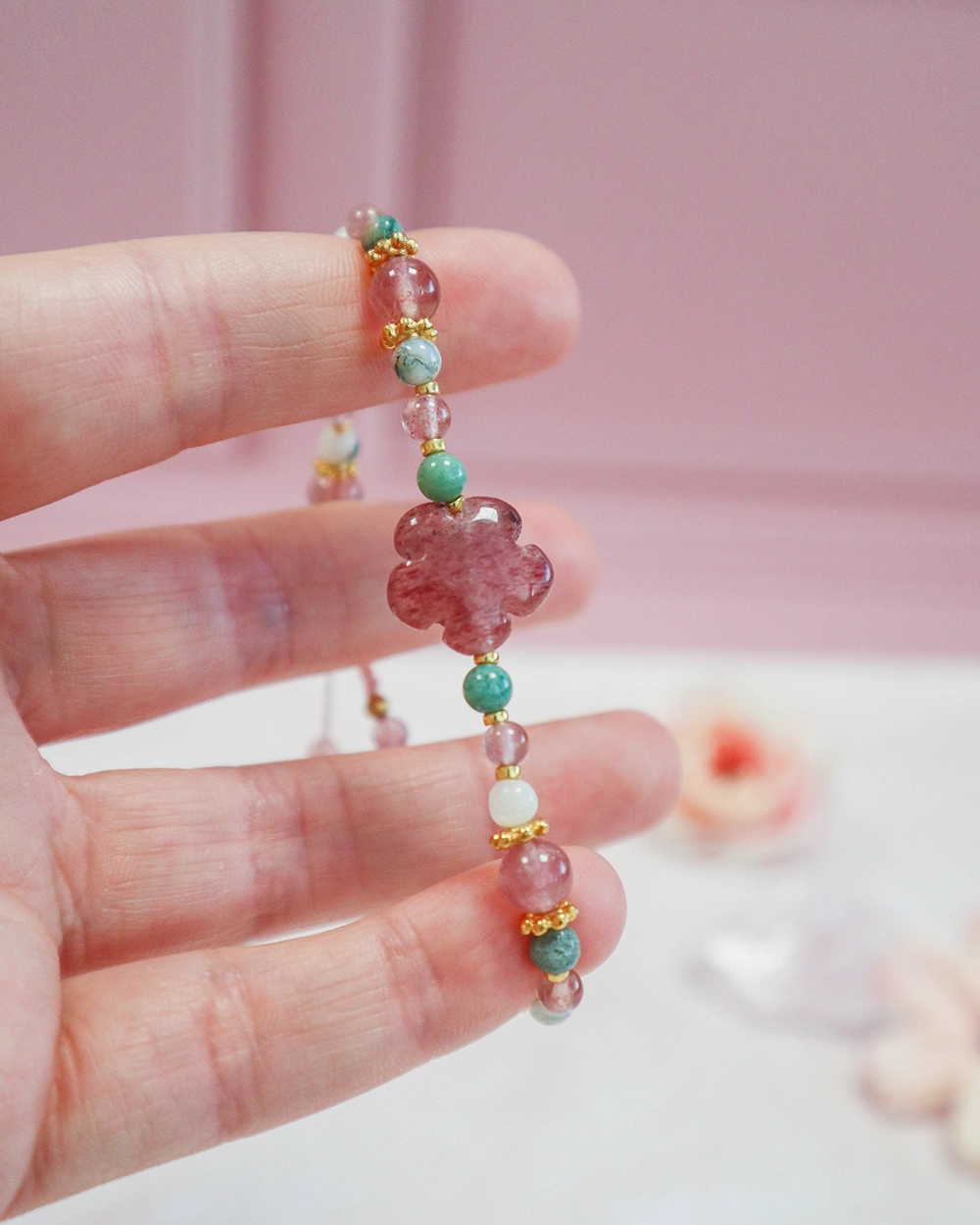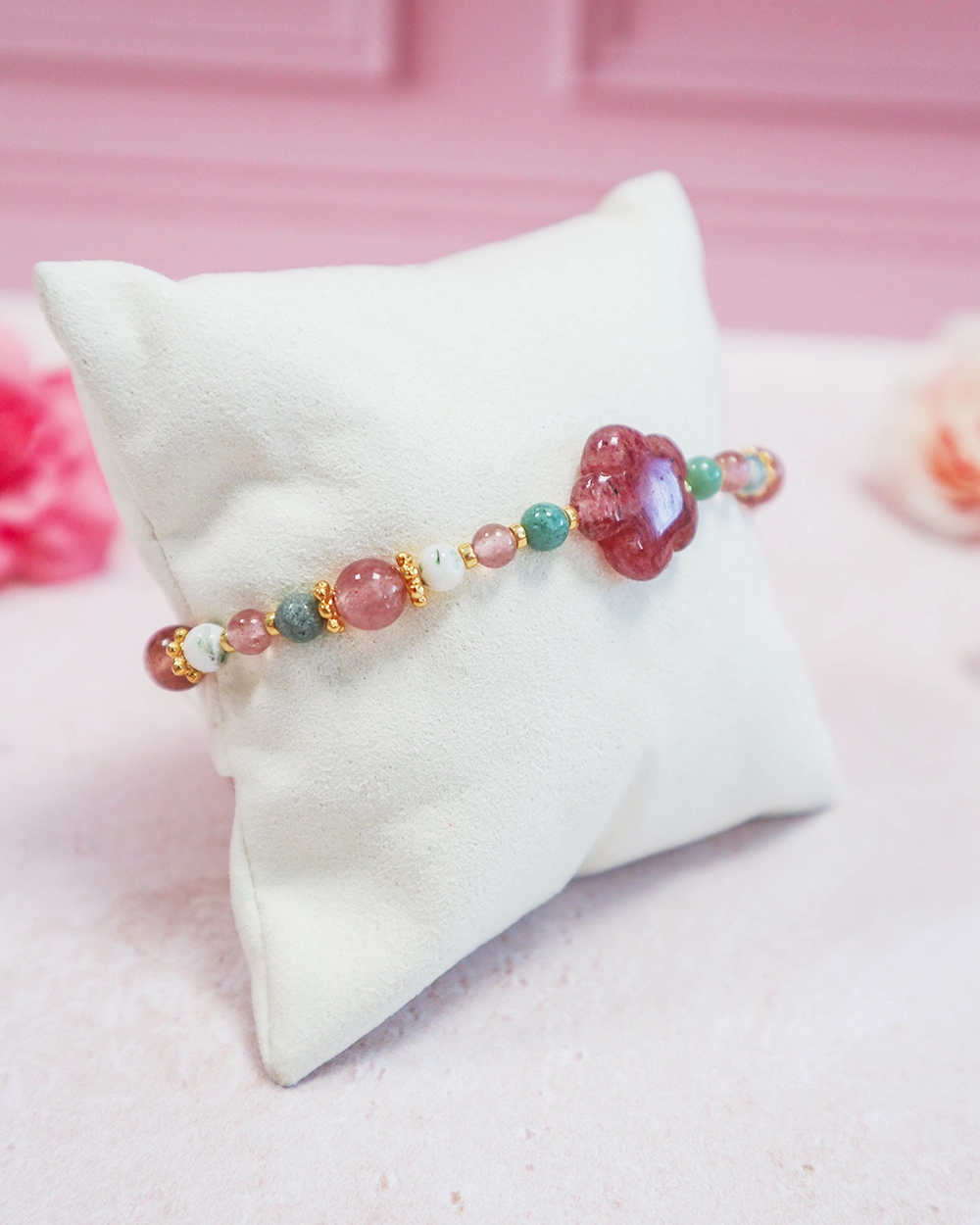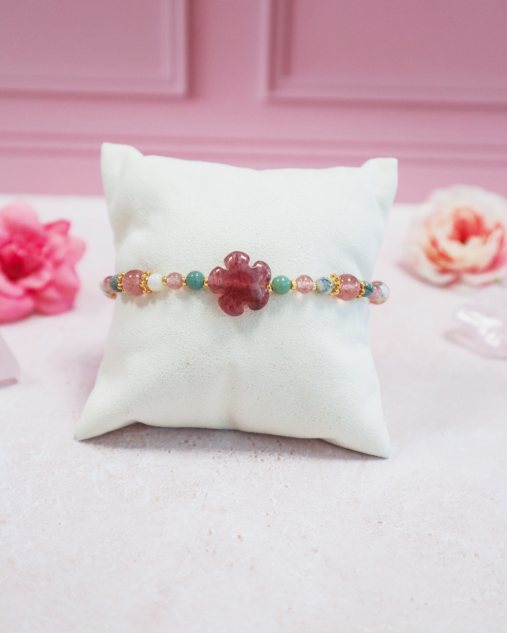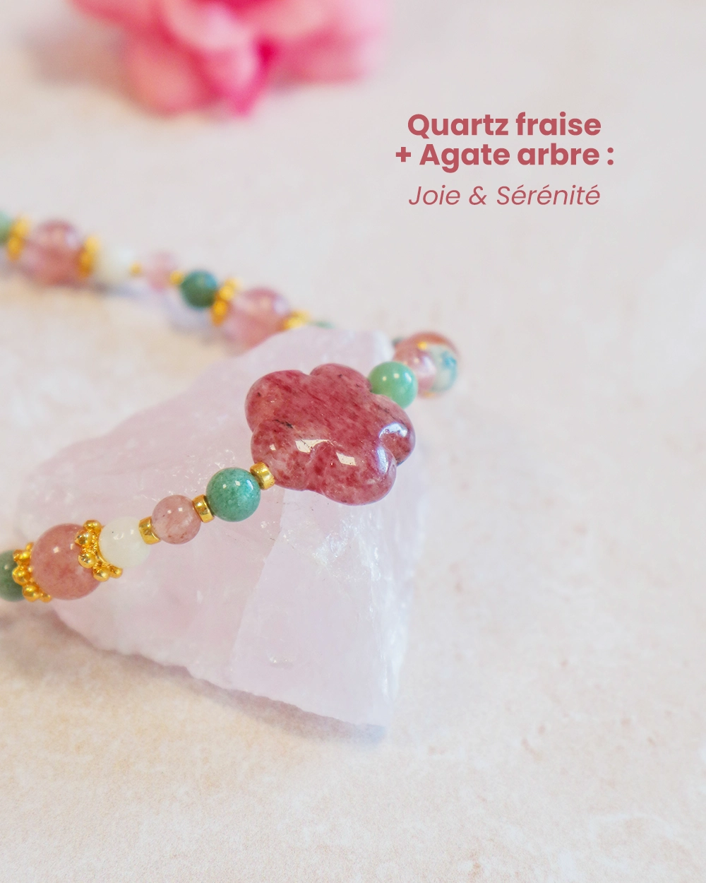 Ce bracelet unique associe la tendresse du quartz fraise à la fraîcheur naturelle de l’agate arbre, pour une énergie à la fois douce, équilibrée et joyeuse.