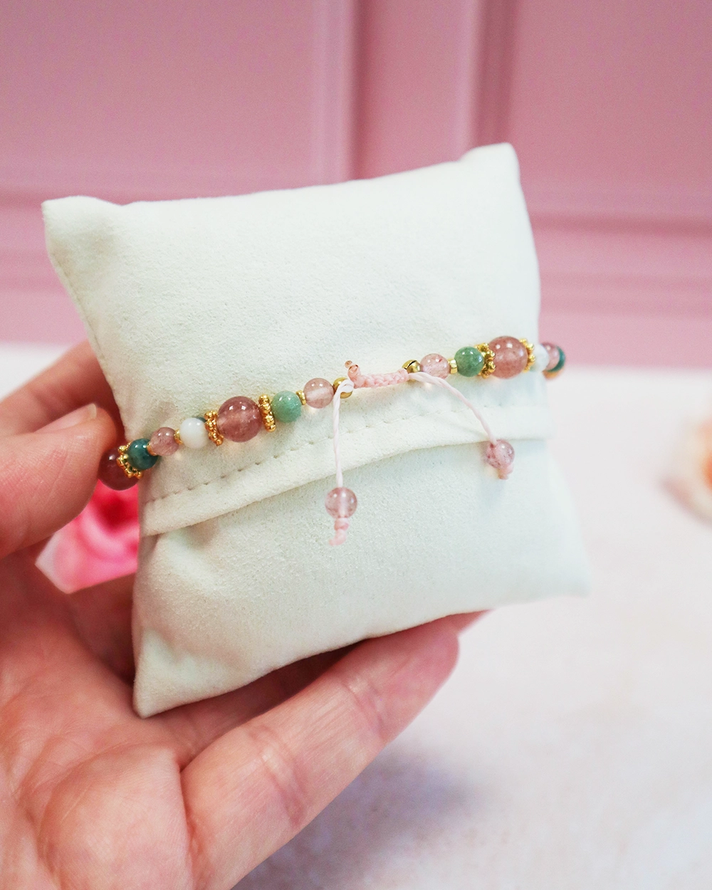 Le bracelet est ajustable grâce à son fermoir coulissant (macramé rose clair), et orné de petites perles dorées pour une touche d’éclat.