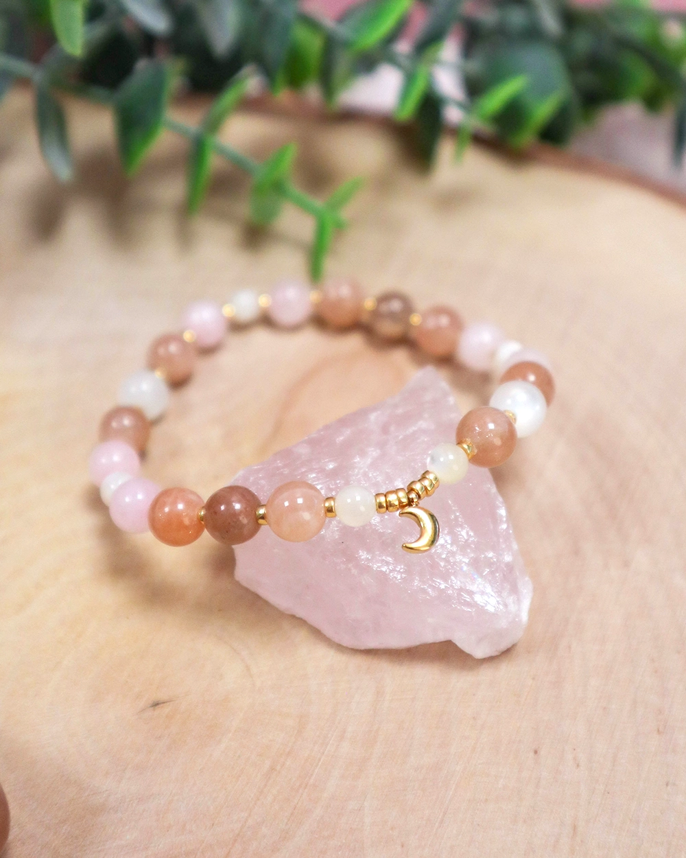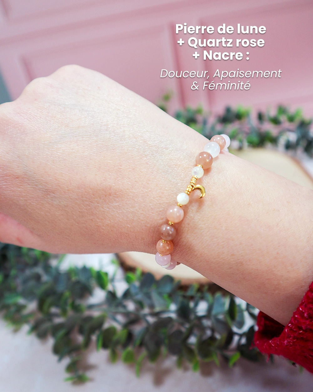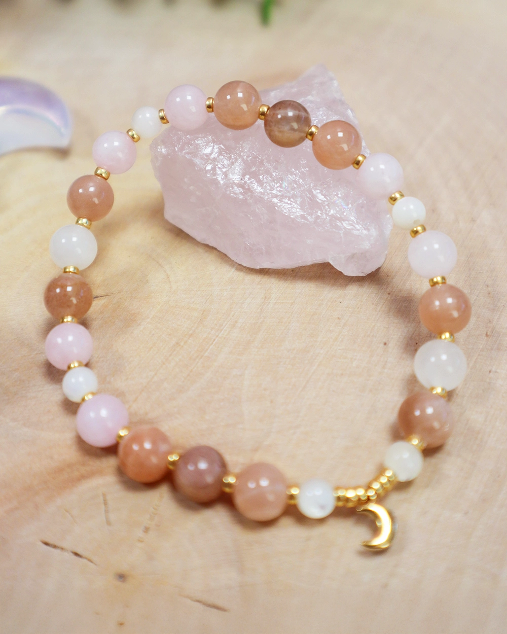 Ce bracelet aux nuances rosées et nacrées associe trois pierres naturelles complémentaires, choisies pour leur douceur et leur symbolique apaisante :