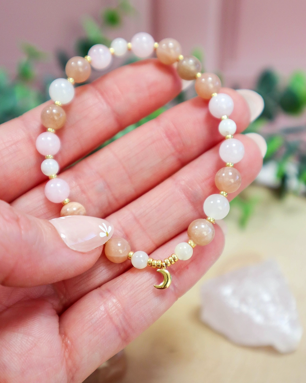 - Pierres naturelles : Pierre de lune multicolore, Quartz rose, Nacre.